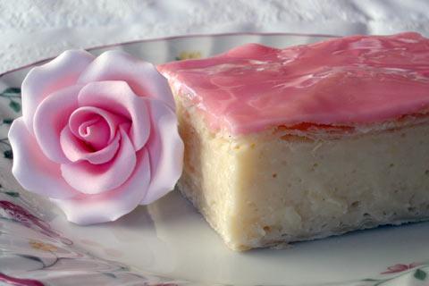 This recipe is based on the traditional South African custard slice, but we used rose water to flavour the icing, and puff pastry to make the crust. You can of course use either lemon juice or vanilla in the glaze icing, which is more traditional than the some-what Bohemian flavour of rose water.